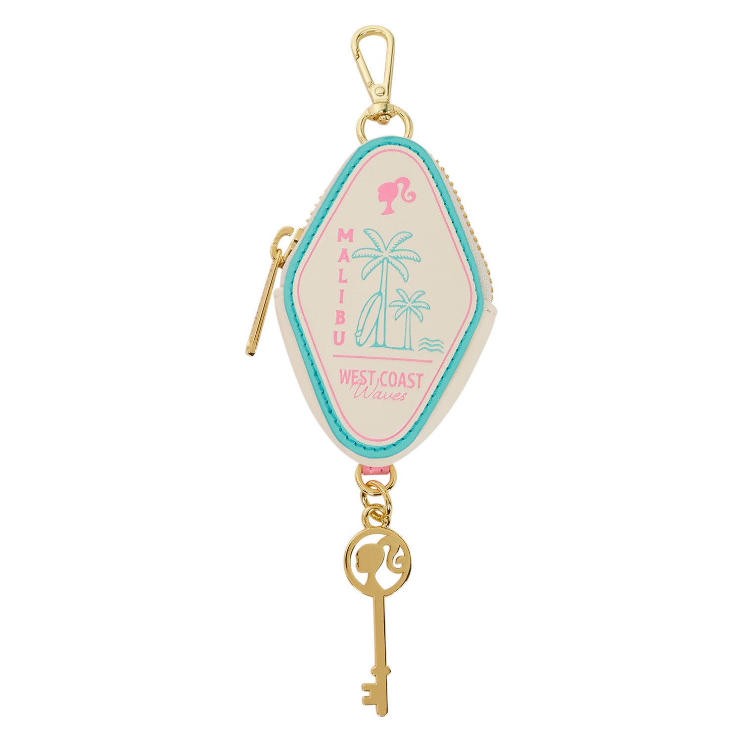 This crossbody bag is inspired by Barbie's pink convertible. You'll find PVC, metal rivet, padded applique, and embroidered details to really make this bag pop. Look closely and you'll see "Barbie" on the license plate! The headlights actually light up for an extra fun detail. Plus, there's a detachable coin bag in the shape of a key charm with a key attached.
