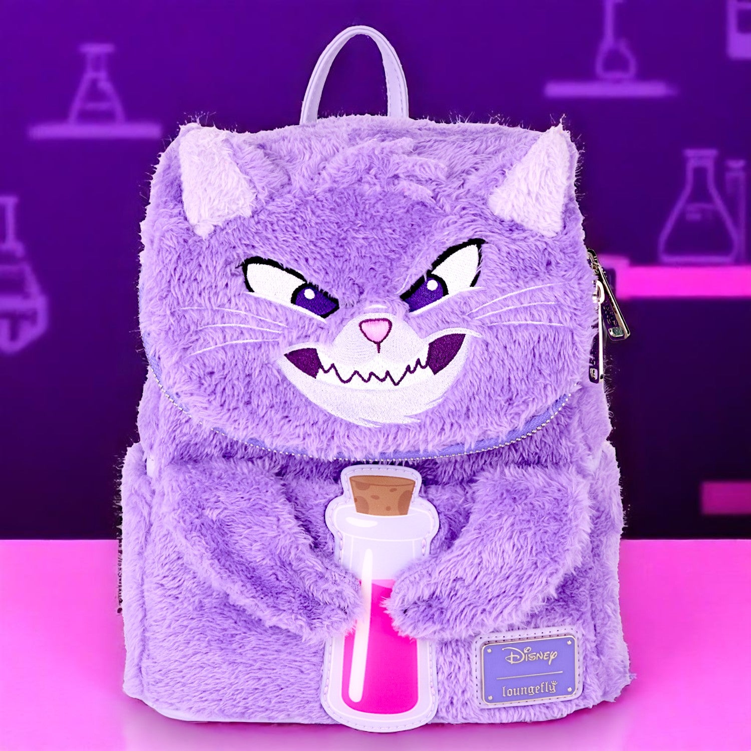 This bag takes the form of Yzma as a cat from The Emperor's New Groove, complete with faux fur and a tail that moves! In her paws, she holds a bottle of "poison" for Kuzco over the front pocket.