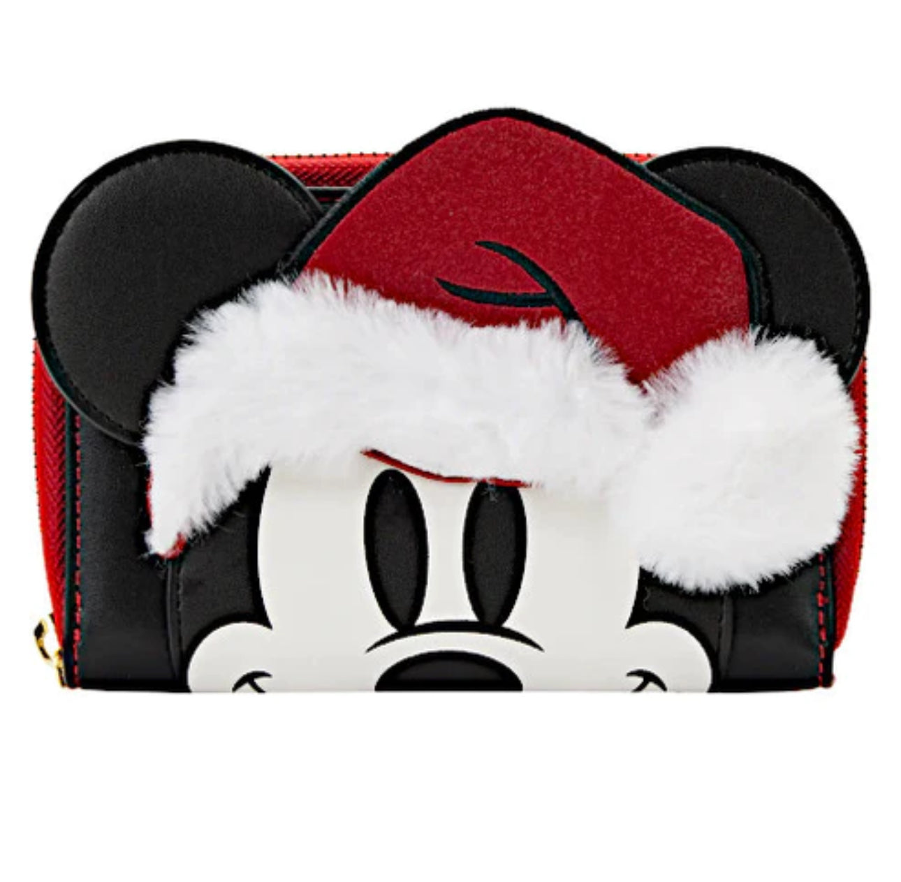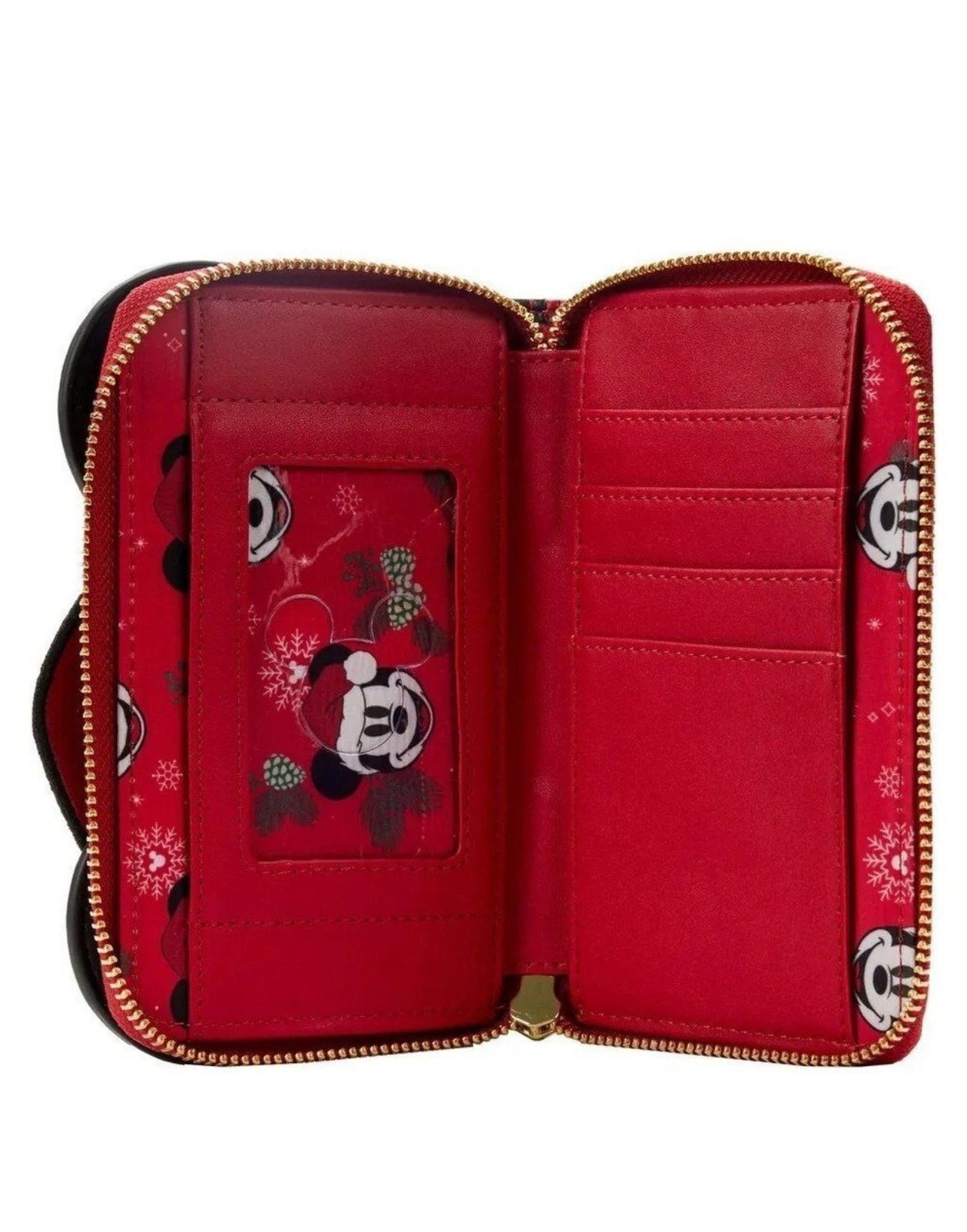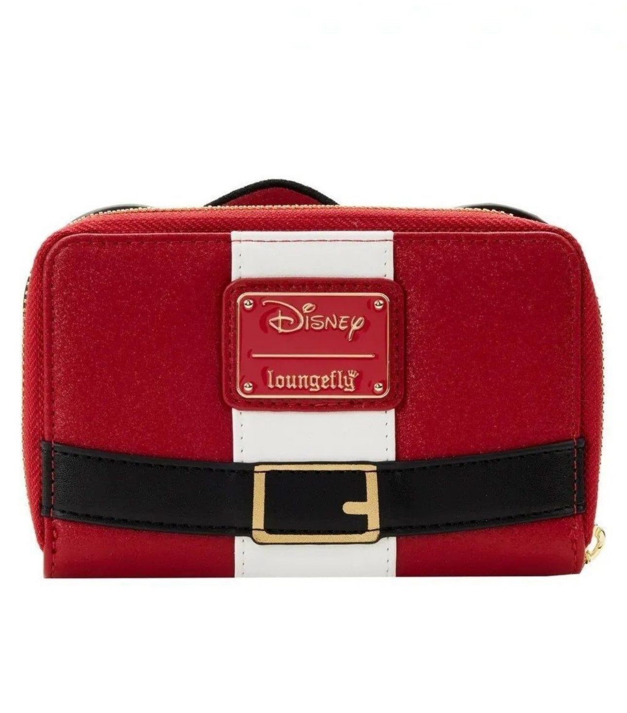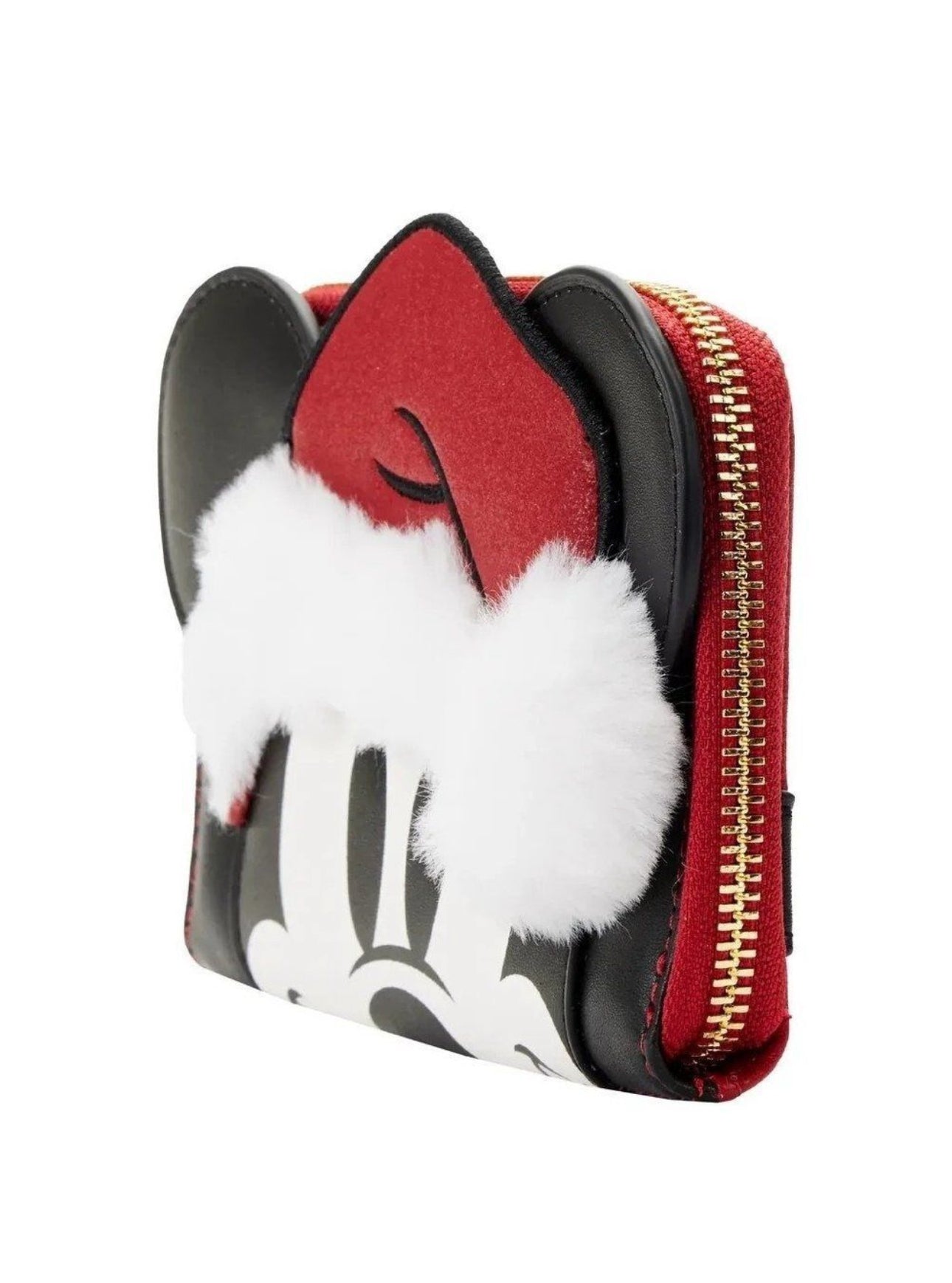 Decorate the castle, and then step out in festive style with this exclusive Loungefly Disney Glitter Mickey Mouse Santa Zip Around Wallet. On the front of this red, shiny wallet, Mickey Mouse dons a red Santa hat. Faux fur details bring the trim of his cap and his suit to life, and a pom-pom adds a finishing touch. Applique details create layers and a pop of Mickey Mouse ears that stick up over the top. On the back, his black belt buckle, with gold-colored hardware, offers a magically realistic detail. On the inside, you’ll find 4 slots for holding cards and 1 clear slot for holding your ID. A die-cut shape of Mickey Mouse’s ears adds a festive touch. It’s the perfect accessory for enjoying the jolly warmth of the season with a magical Disney flair. The Loungefly Disney Glitter Mickey Mouse Santa Zip Around Wallet is made of vegan leather (polyurethane). Wallet zips closed, has sturdy gold-colored metal hardware, and features applique, pom-pom, faux fur, and red glitter details. Take note of the coordinating pattern of the inside lining fabric.