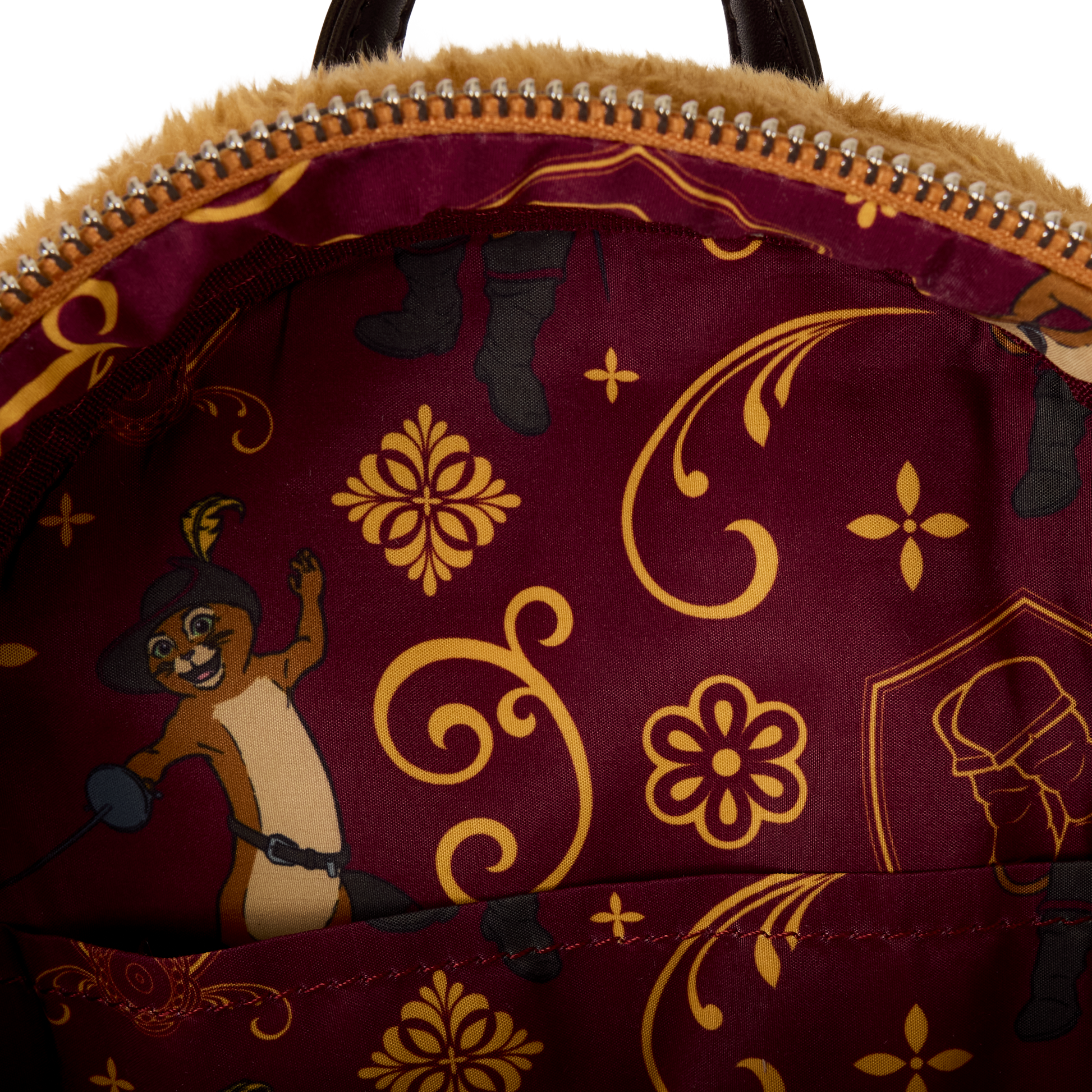 This bag is covered in faux fur, with embroidered facial details and accents of Puss in Boots' ensemble.