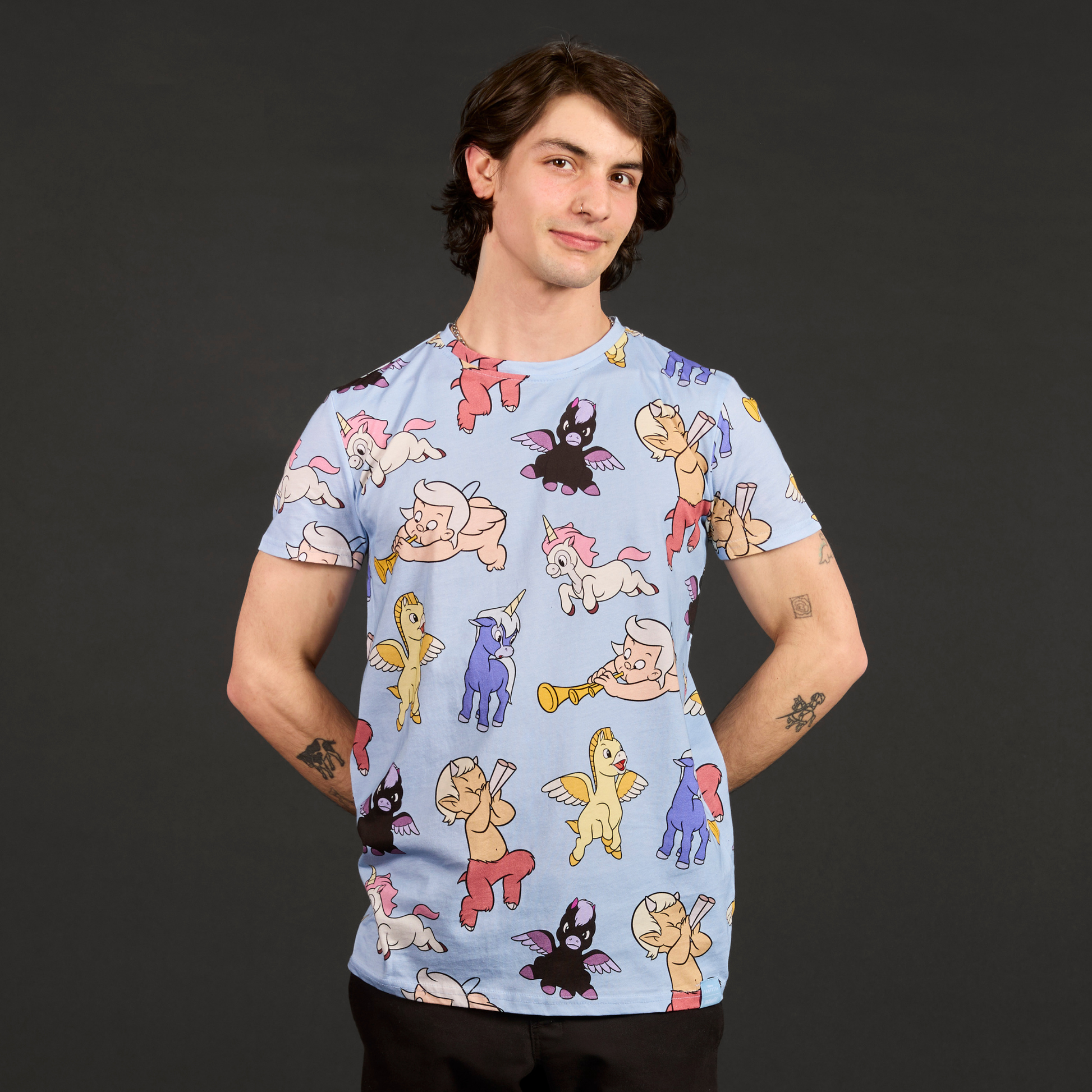 Get lost in the clouds with our whimsical Disney’s Fantasia Pastoral Symphony AOP T-Shirt. Straight from the Pastoral Symphony sequence in Disney’s Fantasia, this pretty pastel all-over print t-shirt features a family of Pegasus and cupids.
