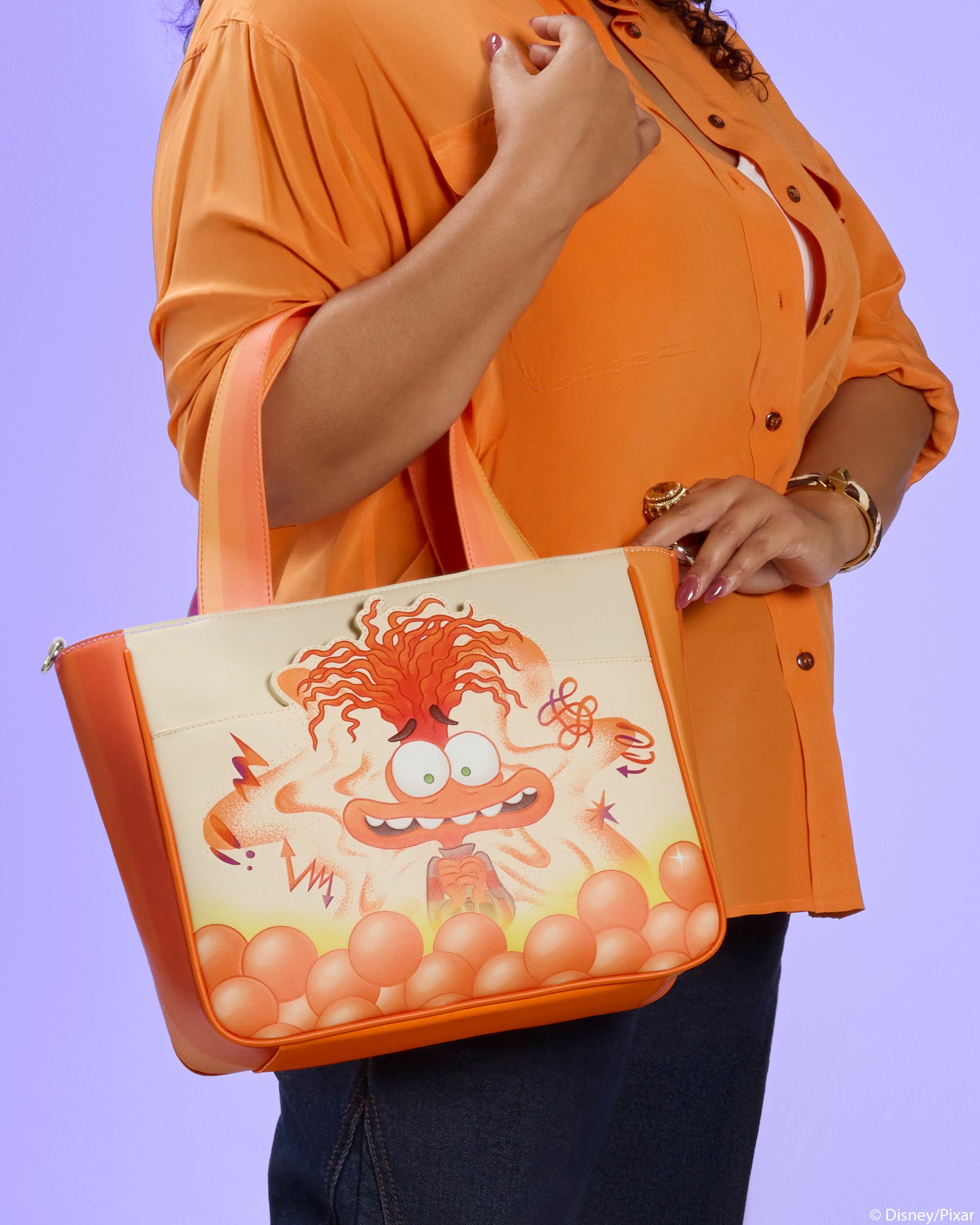 This tote bag is inspired by Anxiety from Disney and Pixar's Inside Out 2. You'll find her front and center on the bag, surrounded by orange memory spheres. Turn it around to find more orange memory spheres and Riley's anxious Sense of Self. Plus, there's a coin bag attached to the strap that features Riley's anxious Sense of Self on one side and Anxiety on the other.