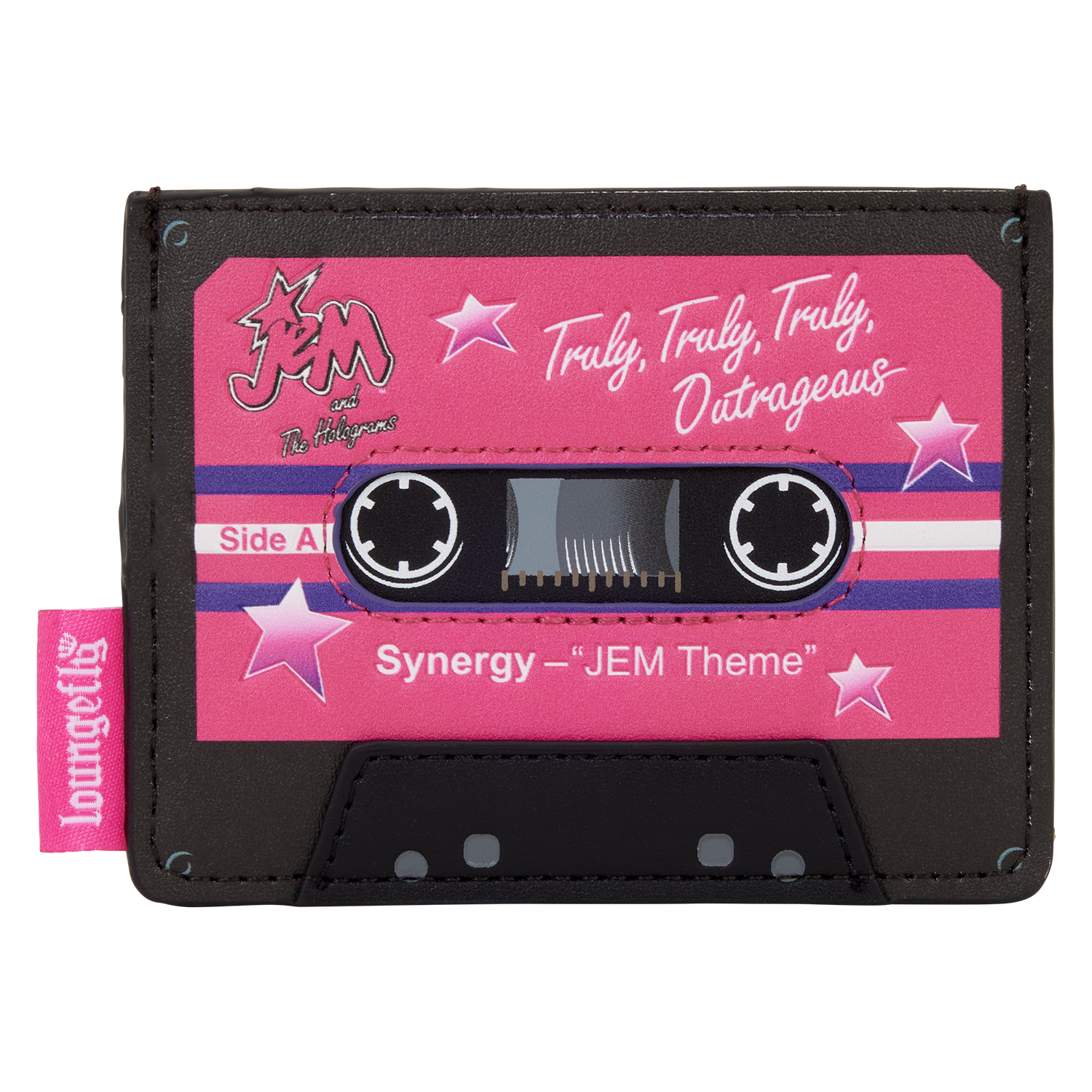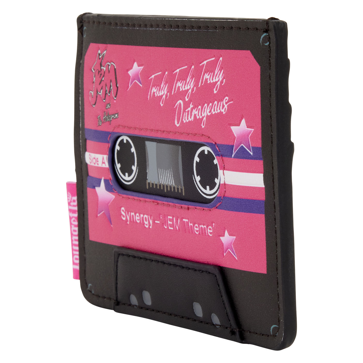 This card holder looks like a Jem and the Holograms cassette that says "Synergy – JEM Theme" and "Truly, Truly, Truly, Outrageous." Turn it around to find three card slots!