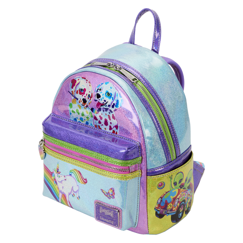 What’s more fun than a big splash of color? Let your style shine with the Loungefly Lisa Frank® Color Block Mini Backpack! Covered in eye-catching holographic backing, this color-blocked accessory displays some of Lisa Frank’s most beloved characters. On the front, you’ll find the Dalmatians Spotty & Dotty™ holding a paintbrush. Markie™ the unicorn prances near a rainbow on the front zipper pocket, where a rainbow heart zipper charm provides easy access to your essentials. Turn the bag around to see a golden retriever on one side pocket while aliens Zoomer & Zorbit™ appear on the other. On the back, Panda Painter™ holds a brush. This mini backpack makes a vibrant addition to any outfit and has plenty of room to hold your treasures.