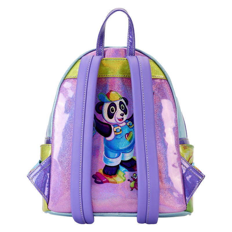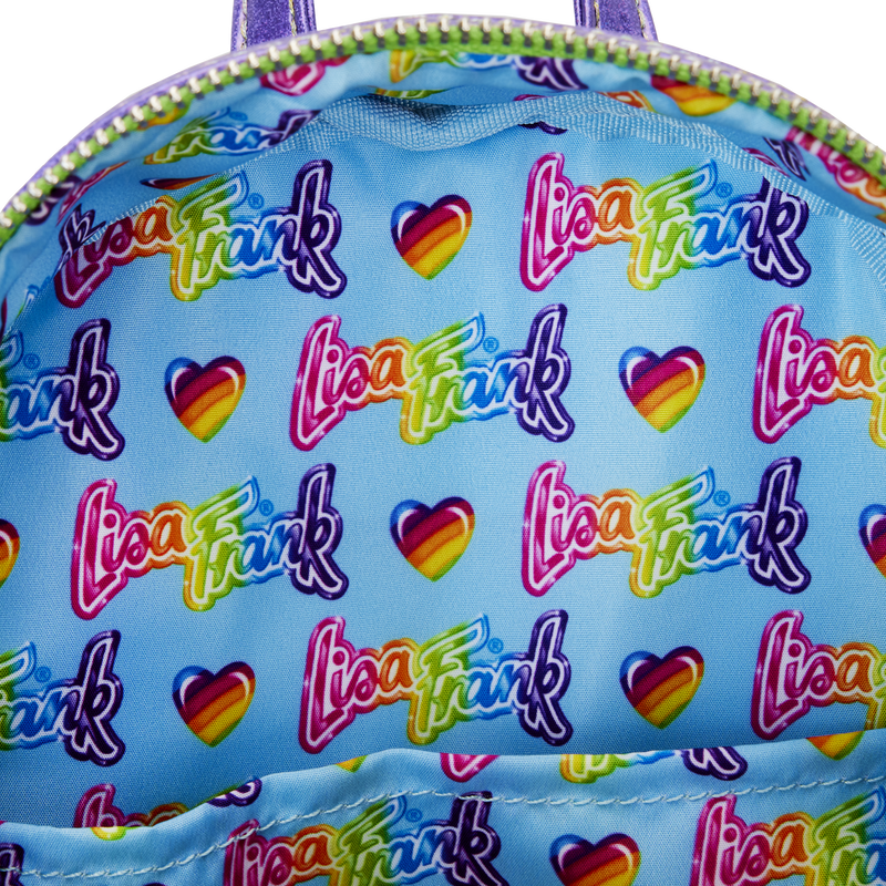 The Loungefly Lisa Frank Color Block Mini Backpack is made of holographic vegan leather (polyurethane). Bag has adjustable shoulder straps and shiny silver hardware. Additional features include debossed and printed details. Take note of the coordinating inside lining.