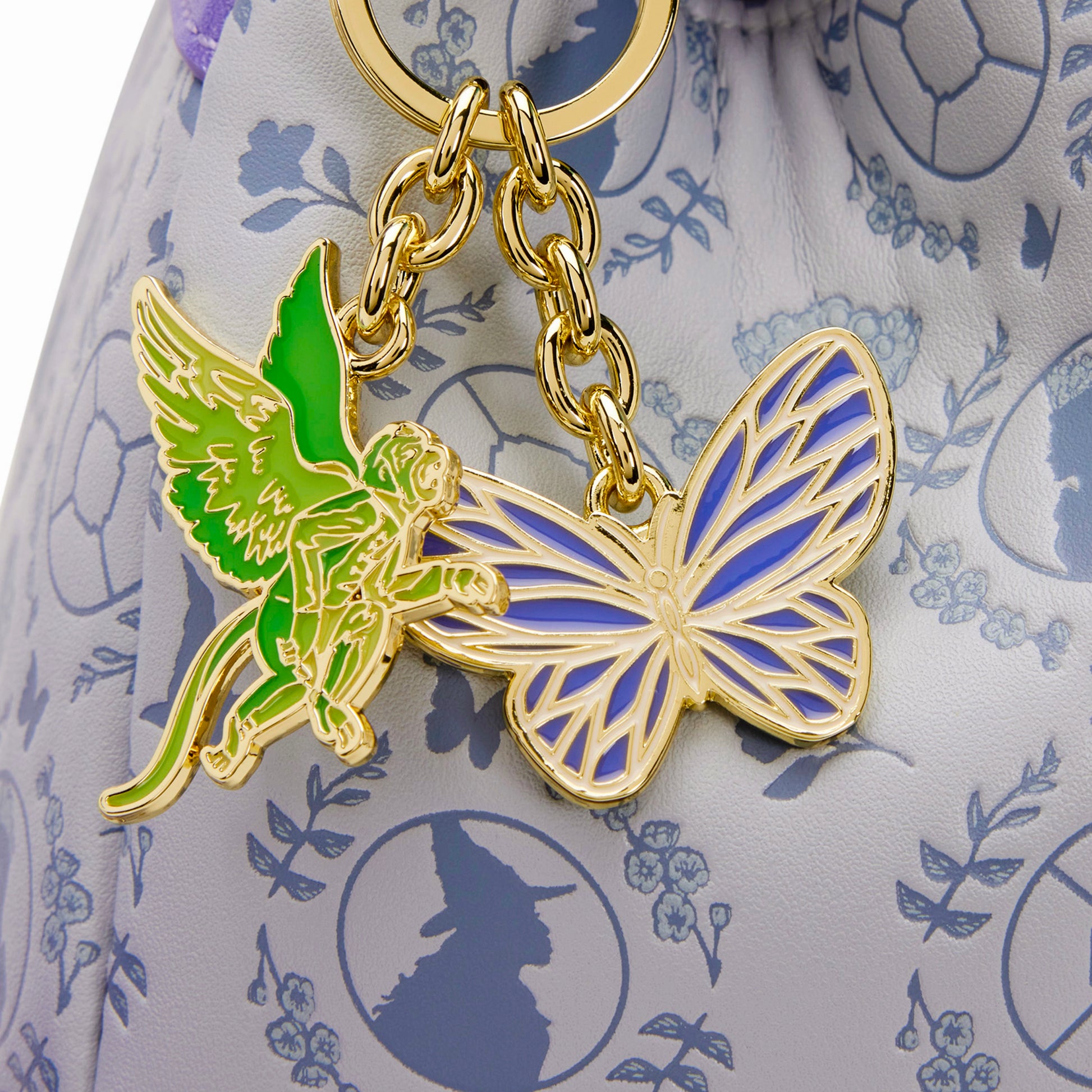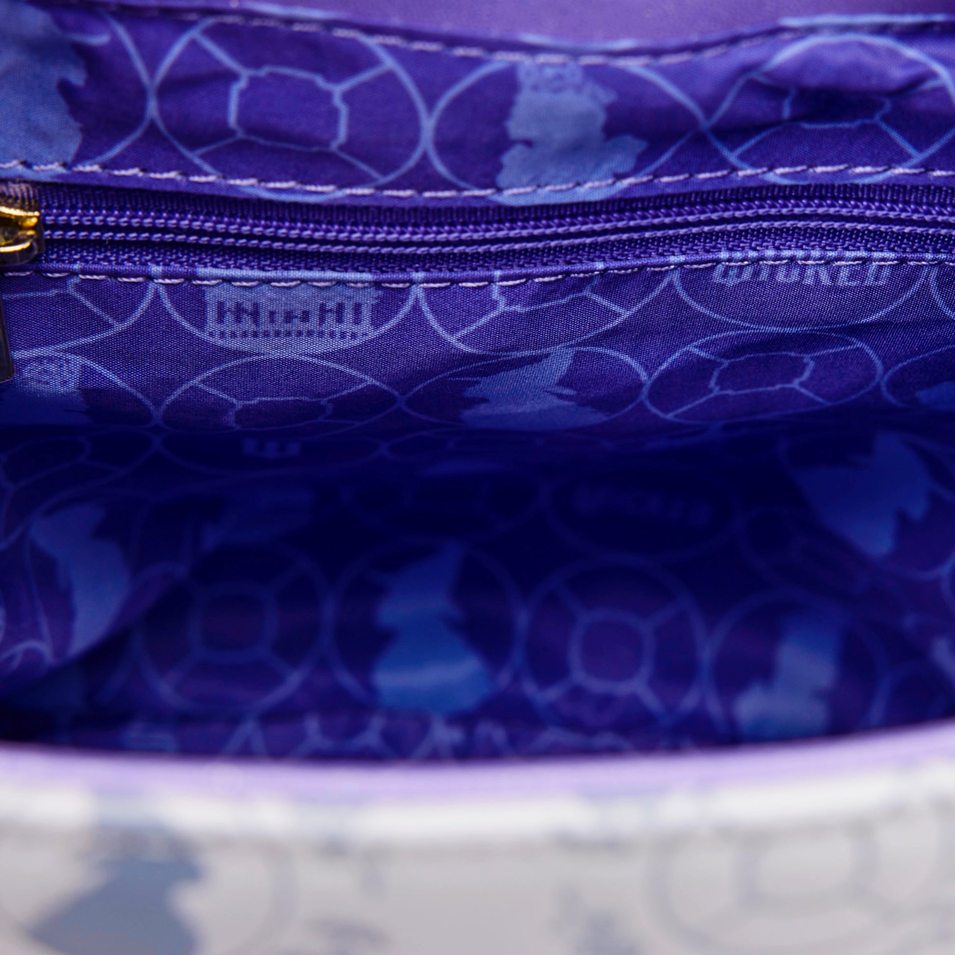 This bag features shimmer material with an embossed pattern showcasing symbols and silhouettes of Elphaba and Glinda. On the top flap, you'll find a magnetic snap closure that features the silhouettes of Glinda and Elphaba. Attached to the bag is a keychain featuring charms inspired by these characters. This bag can convert between a sling or a mini backpack; all you have to do is unzip the strap to make it into two!