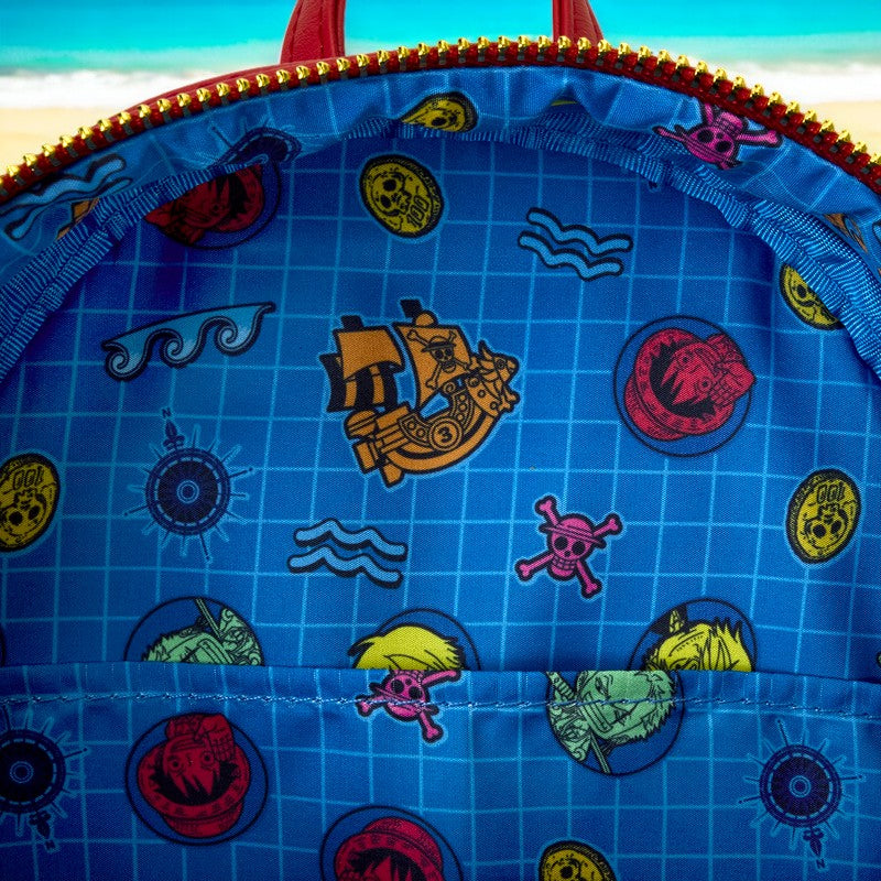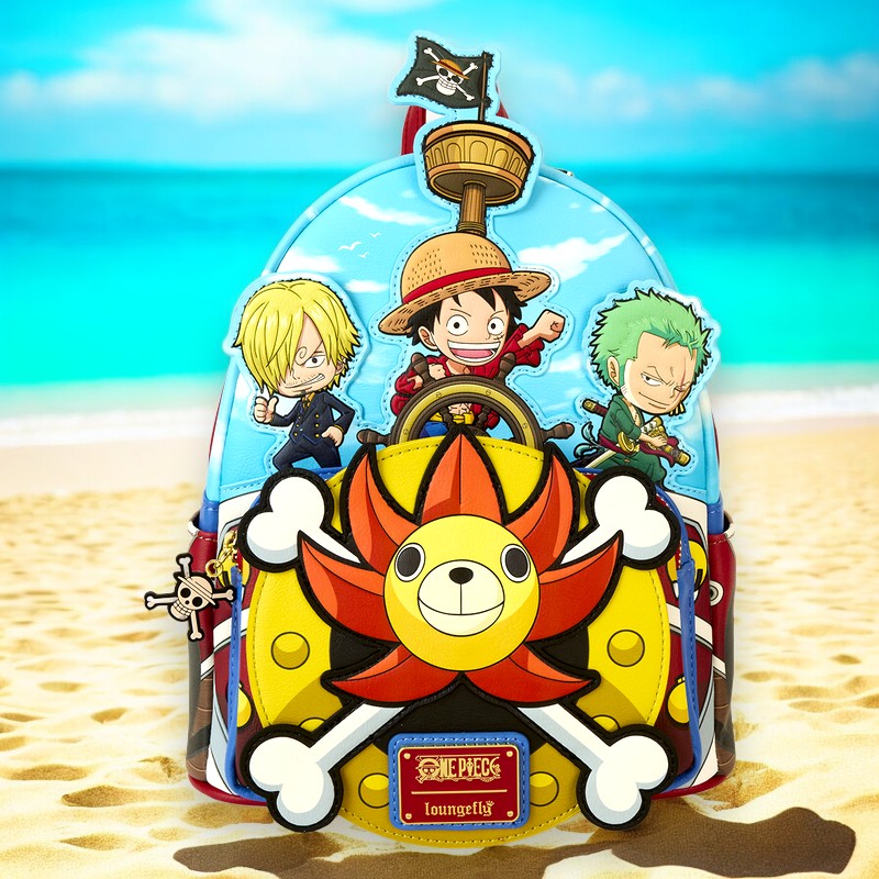 Raise the sails and take the helm! Prepare for adventures with this One Piece mini backpack. It looks like a jolly crew has gathered on the Thousand Sunny. This ship’s mascot comes to life in circular applique form, its lion’s mane “blowing” in the breeze. Just behind this applique, you’ll find a front pocket for securing smaller items during your journeys. Above, Monkey D. Luffy steers the ship, and he’s flanked by Sanji and Roronoa Zoro. The crow’s nest and the Jolly Rodger flag rise up over the top of the backpack, while a silicone Jolly Rodger zipper charm tops off the look. Flip the backpack around, and you’ll find a print of Monkey D. Luffy’s “Wanted” poster. Pack just what you need for a day’s travels, gather a merry band of friends, and set sail in style.